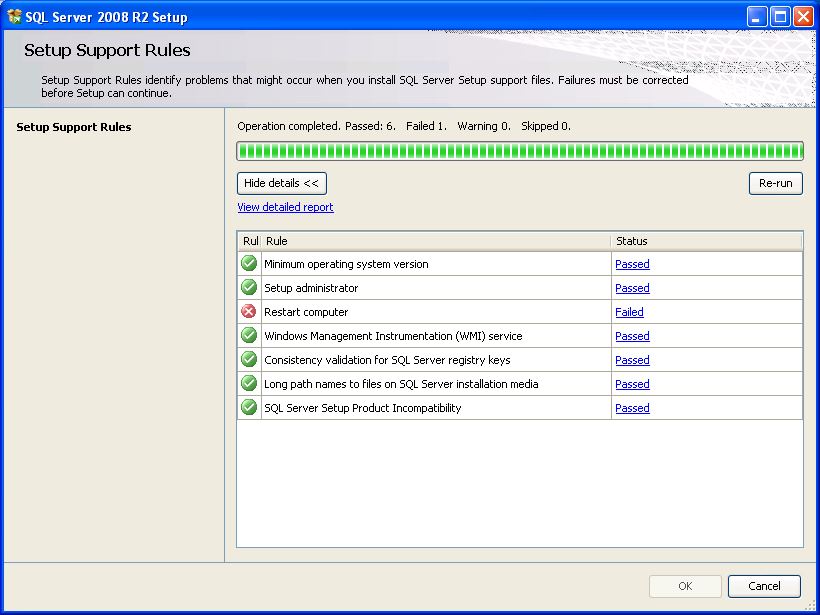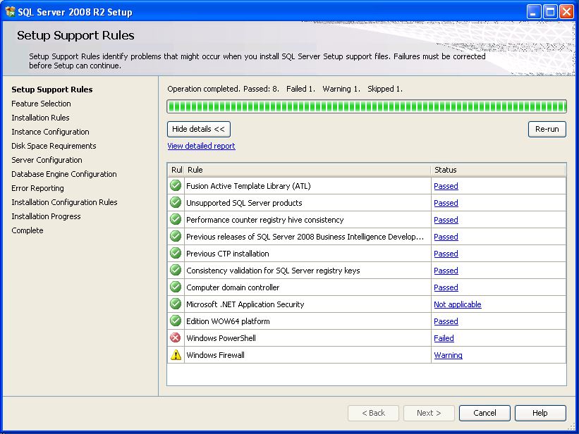 - Ak žiadne požadované pravidlo nie je v stave Failed, je možné pokračovať v inštalácii kliknutím na tlačidlo Next >.