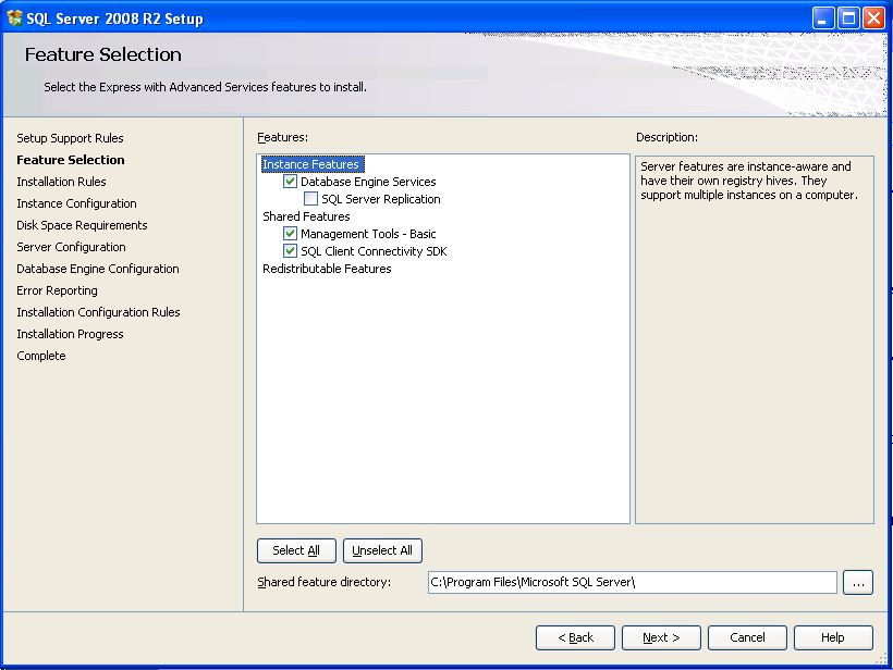 - Vyberte komponenty, ktoré budú inštalované a pokračujte kliknutím na tlačidlo Next >. (SQL Server Replication, tomuto rozšíreniu zrušte označenie.)