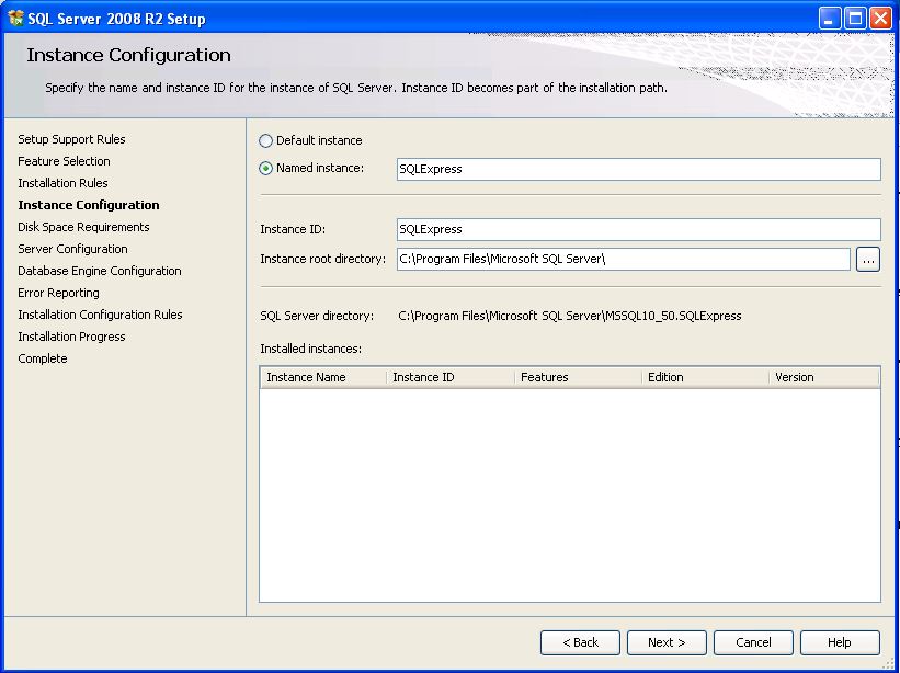 - Názov inštancie ponechajte prednastavený SQLExpress a pokračujte kliknutím na Next >.