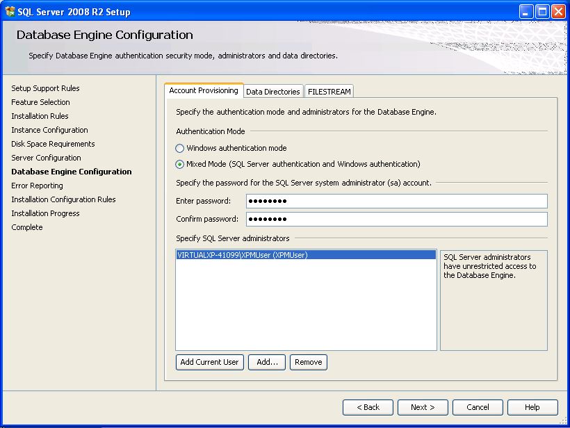 - V nastaveniach databázového enginu (Database Engine Configuration) v záložke Account Provisioning:
