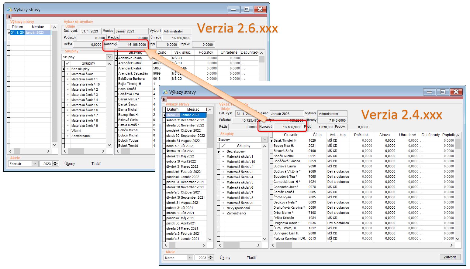 - Finančné stavy stravníkov - na základe posledného výkazu stravovaných osôb sa prenášajú zostatky stravníkov. (Ak je vytvorený výkaz napr. za február, koncová hodnota stravníka na výkaze sa prenesie ako jeho počiatočný finančný stav.)