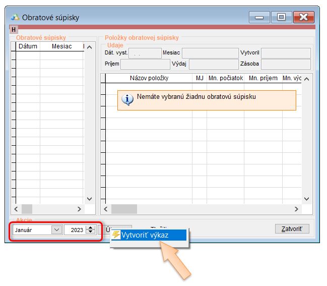 - Vytvoriť Obratovú súpisku skladu za mesiac, ku ktorému boli prenesené počiatočné skladové zásoby.