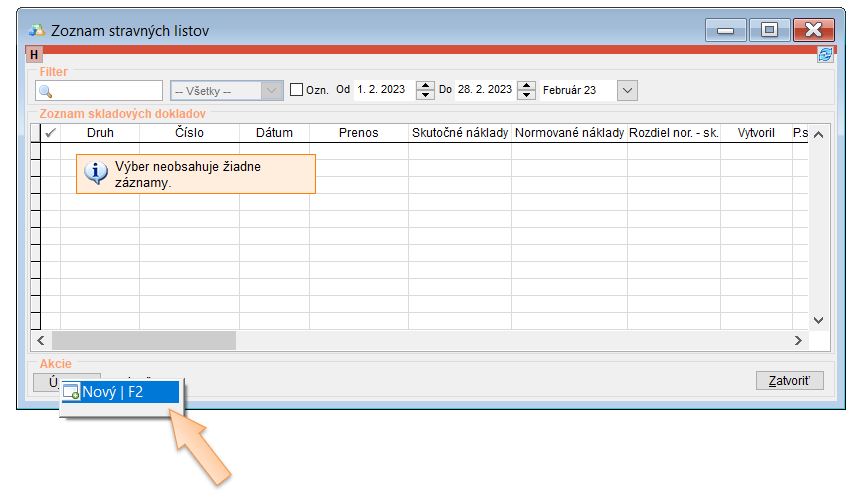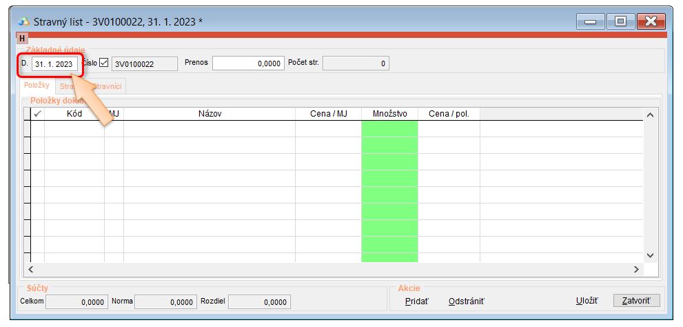 - Vytvoriť počiatočný stravný list ku koncu predchádzajúceho mesiaca od ktorého pokračujete v evidencii, kde sa nahodí zostatok.