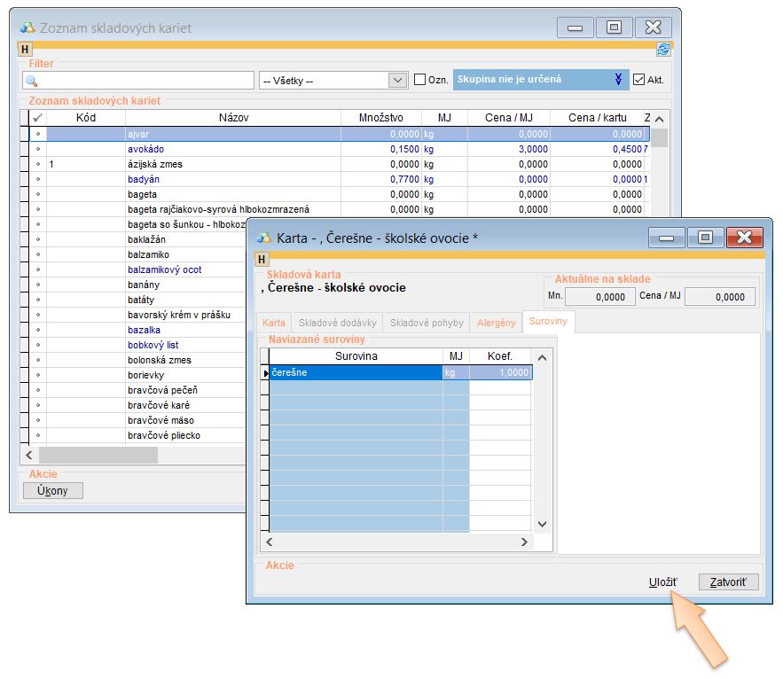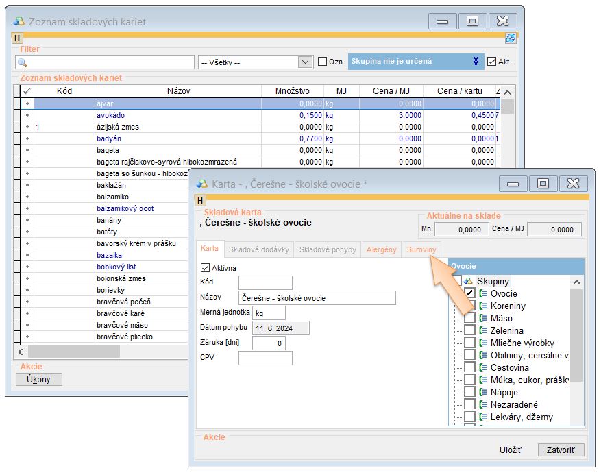 - Prejdite do záložky Suroviny.