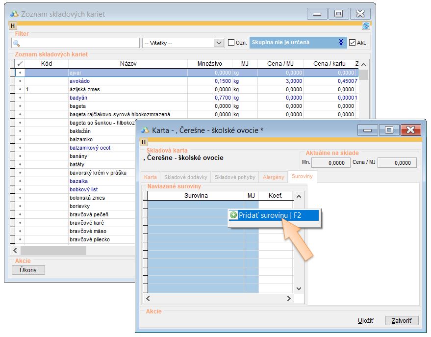 - Kliknite pravým tlačidlom do zoznamu a kliknite na Pridať surovinu.