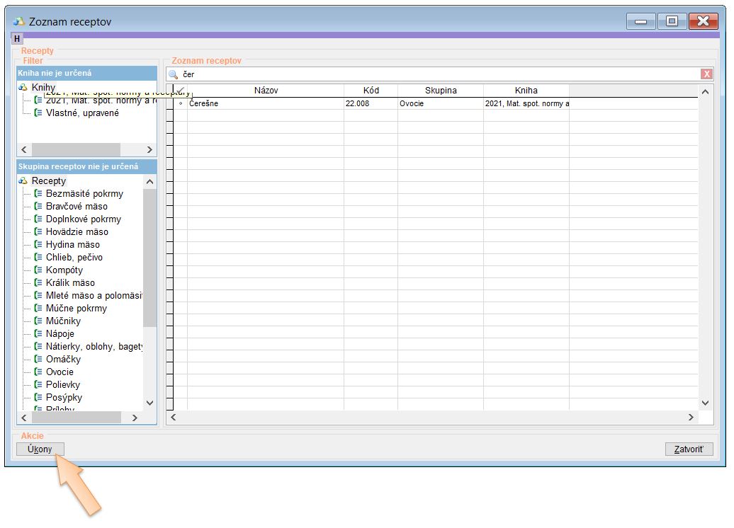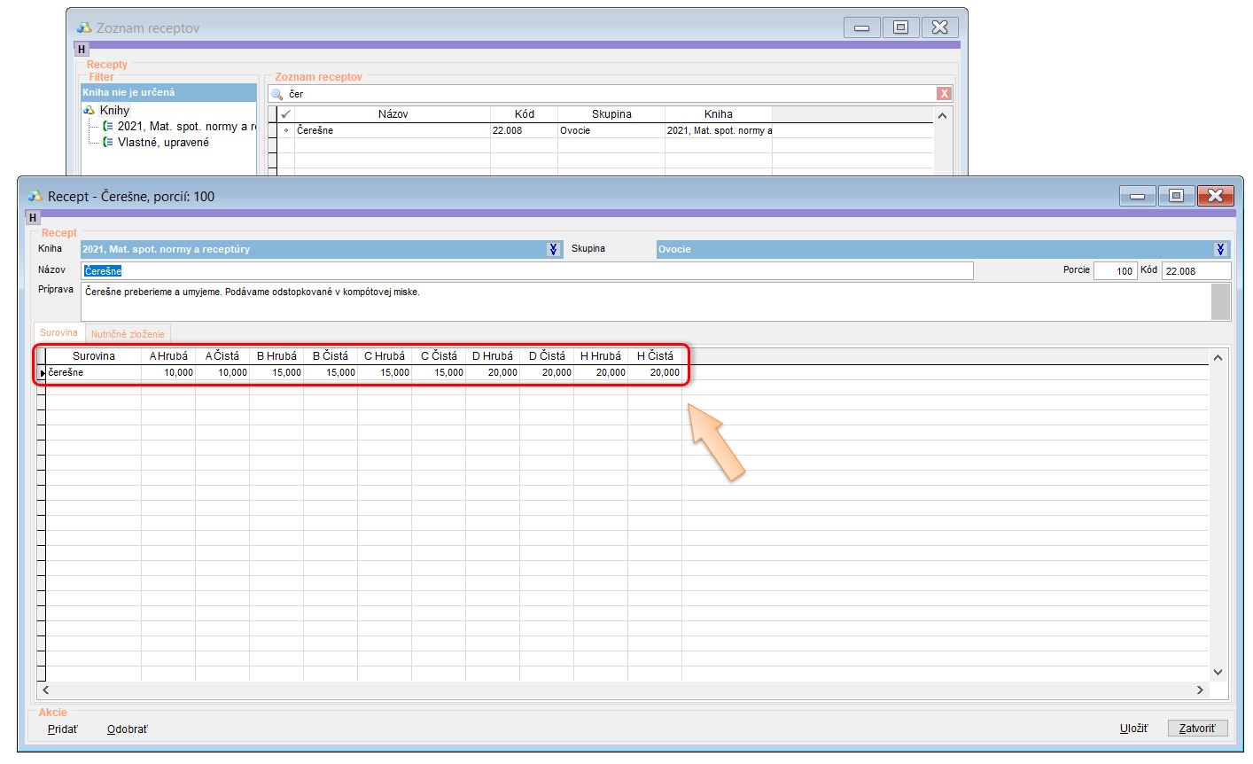 - Pre dodržanie normovaných hmotností vyhľadajte receptúru. (V našom prípade receptúru Čerešne.)