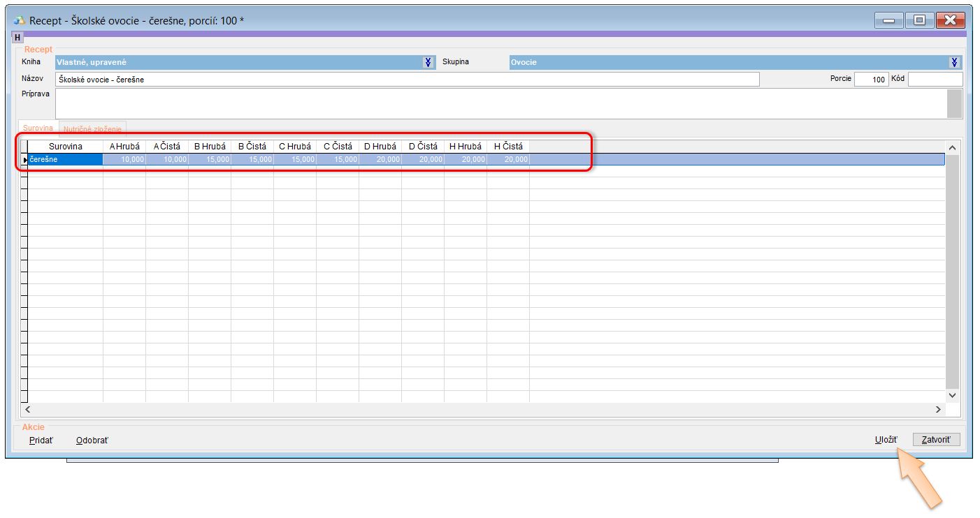 - Vypňte Názov receptúry. (V našom prípade Čerešne - školské ovocie.)