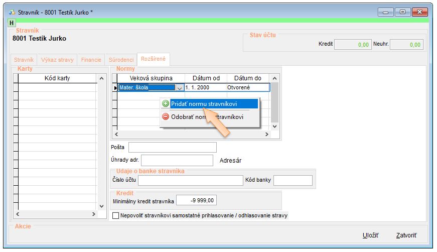 - Kliknite pravým tlačidlom myši v stĺpci Veková skupina, vyberte možnosť Pridať normu stravníkovi.