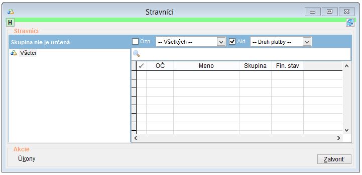 Okno stravníkov zobrazíte po kliknutí na Stravníci v hlavnom menu (alebo na tlačidlo s písmenom S na nástrojovej lište). V tomto okne je možné vytvárať nových stravníkov alebo upravovať stávajúcich, vytvárať a prideľovať skupiny stravníkov.