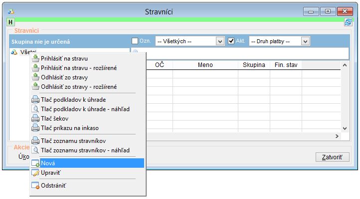 - Nového stravníka vytvoríte kliknutím na tlačidlo Úkony a Nový, alebo kliknutím pravým tlačidlom do zoznamu stravníkov a následne výberom možbosti na Nový.