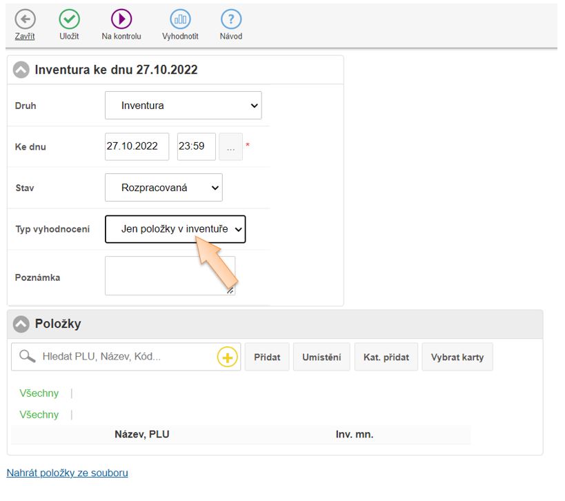 - V části Inventura ke dni nastavte Typ vyhodnocení - Jen položky v inventuře.