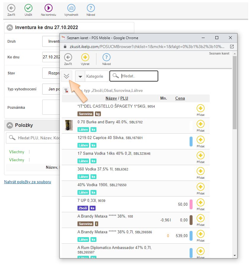 V aplikaci lze kromě rychlých inventur baru a kuchyně, nebo inventury celého skladu provést i inventuru vybraných karet nebo celých kategorií. Stačí si jen tyto karty při inventuře podle požadovaných preferencí vybrat.