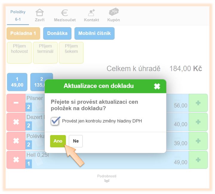 - Přejete si provést aktualizaci cen položek na dokladu? - po kliknutí na Ano se provede přepočet DPH na položkách.