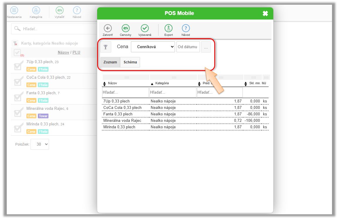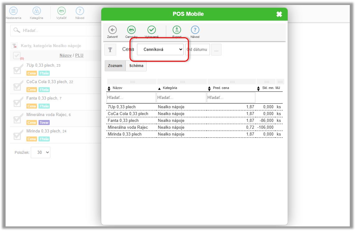 - Kliknite na tlačidlo Cenovky.