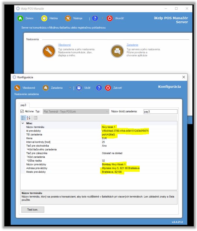 Na KIOSKu je nainštalovaná aplikácia iKelp POS Manažér server, kde je nakonfigurované zariadenie ako platobný terminál s príslušným kódom.