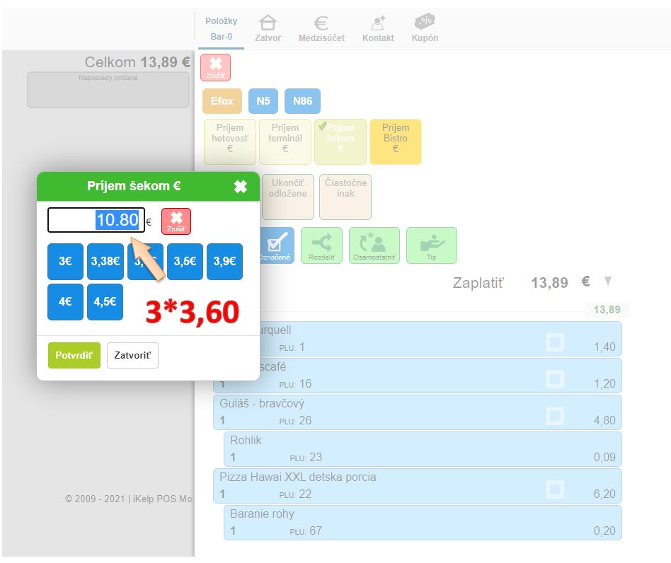 - Zadajte hodnotu platidla (bankoviek / šekov) pomocou klávesnice, kliknite na * a zadajte ich počet. Aplikácia automaticky dopočíta hodnotu.