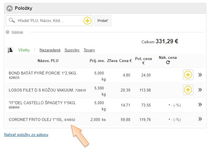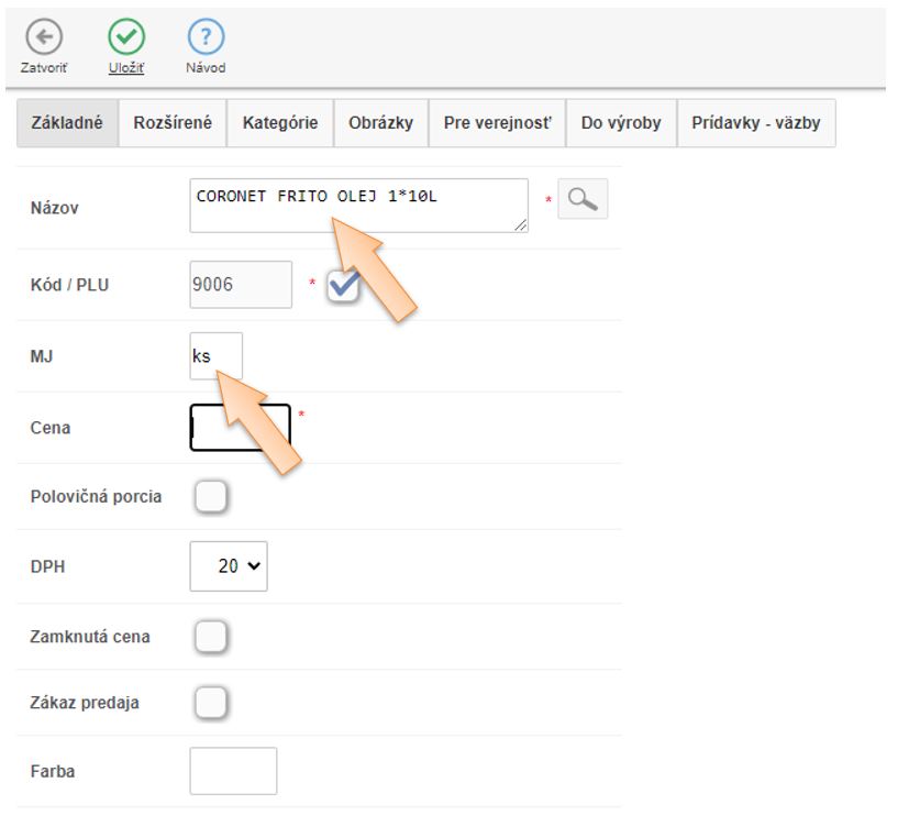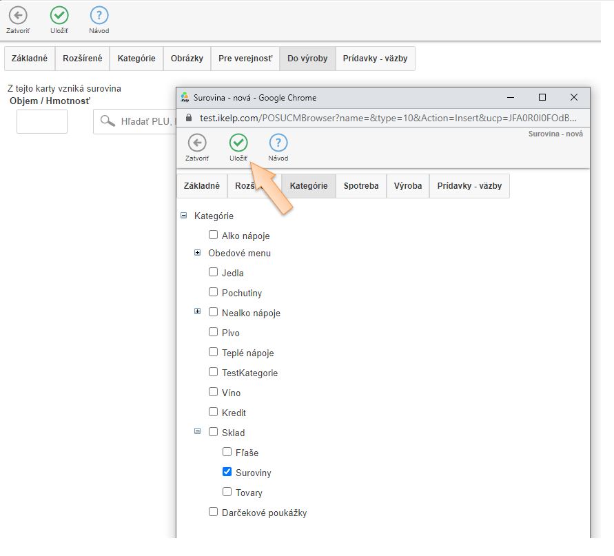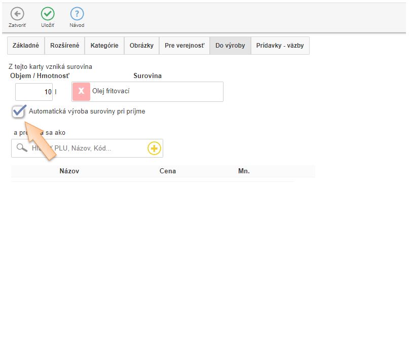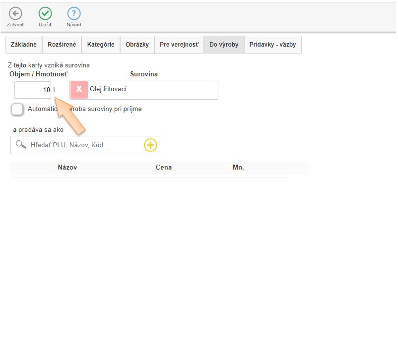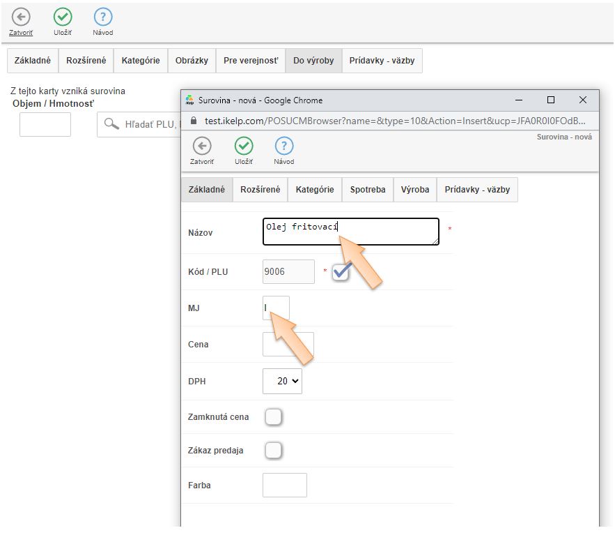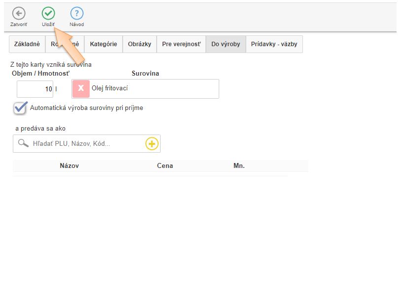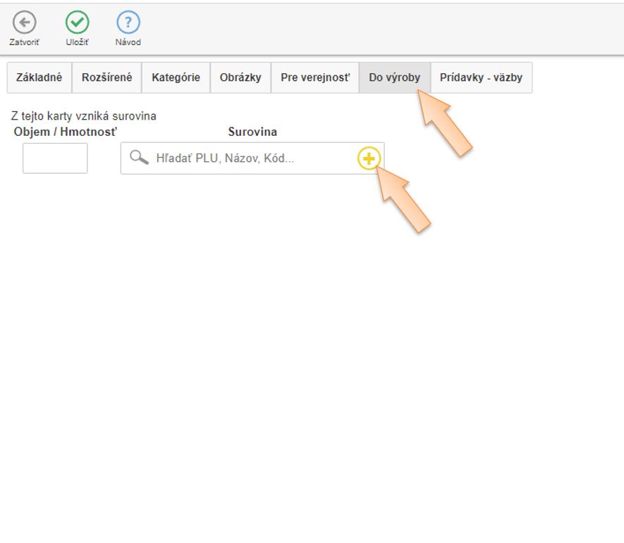 - V záložke Do výroby kliknutím na ikonu + vytvorte kartu suroviny používanej na výrobu receptúr.