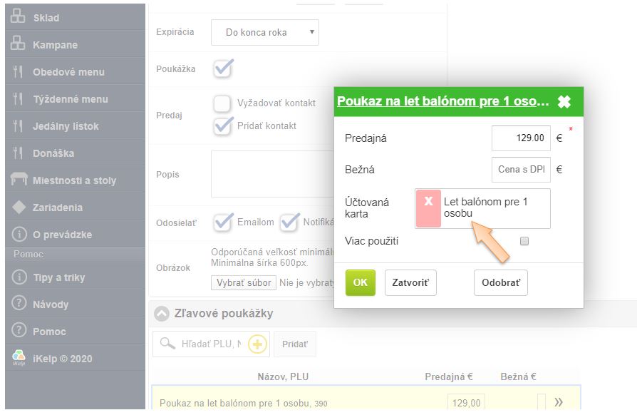 • Pre sledovanie predajov predávaných tovarov / služieb doplňte Účtovanú kartu, položku, ktorá sa pri následnom uplatnení kupónu odpíše zo skladu. Ide o kartu, ktorú je možné predávať aj bežne, ako tovar / službu, alebo je možné na ňu uplatniť JÚP.