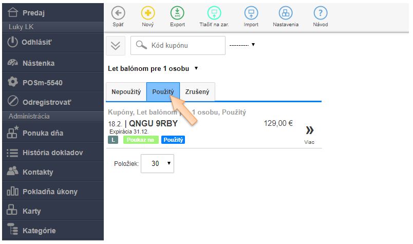 • Kliknite na príslušnú kampaň v zozname a zobrazí sa zoznam vygenerovaných / použitých a nepoužitých kupónov.