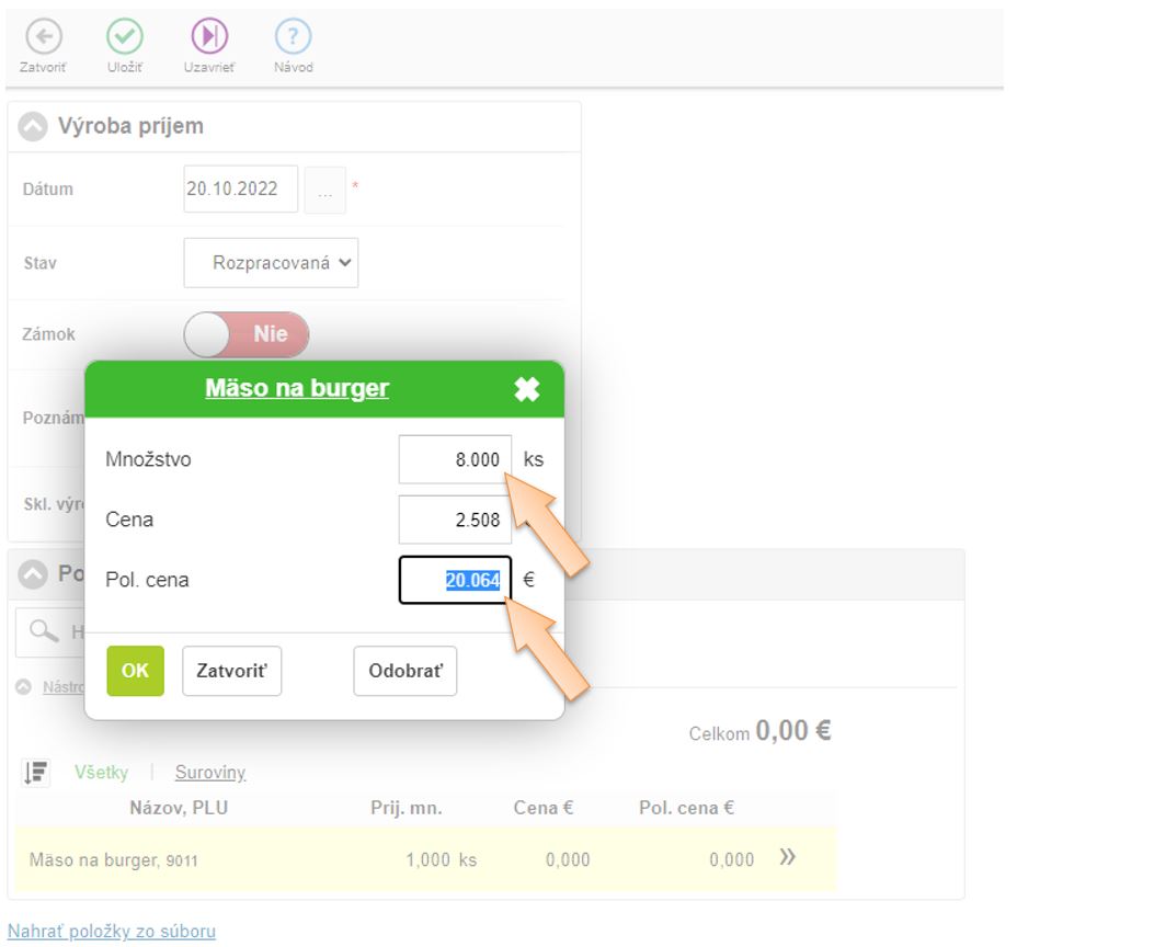 4. Vložte položky do dokladu ktoré vznikajú výrobou, zadajte množstvo a skladovú cenu.