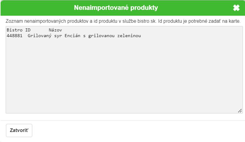 Ak import produktov neprebehne úspešne a systémy nevedia správne nový produkt spárovať, iKelp POS Mobile zobrazí hlásenie (tabuľku s produktami), ktoré sa nepodarilo spárovať spolu s Bistro ID číslami.