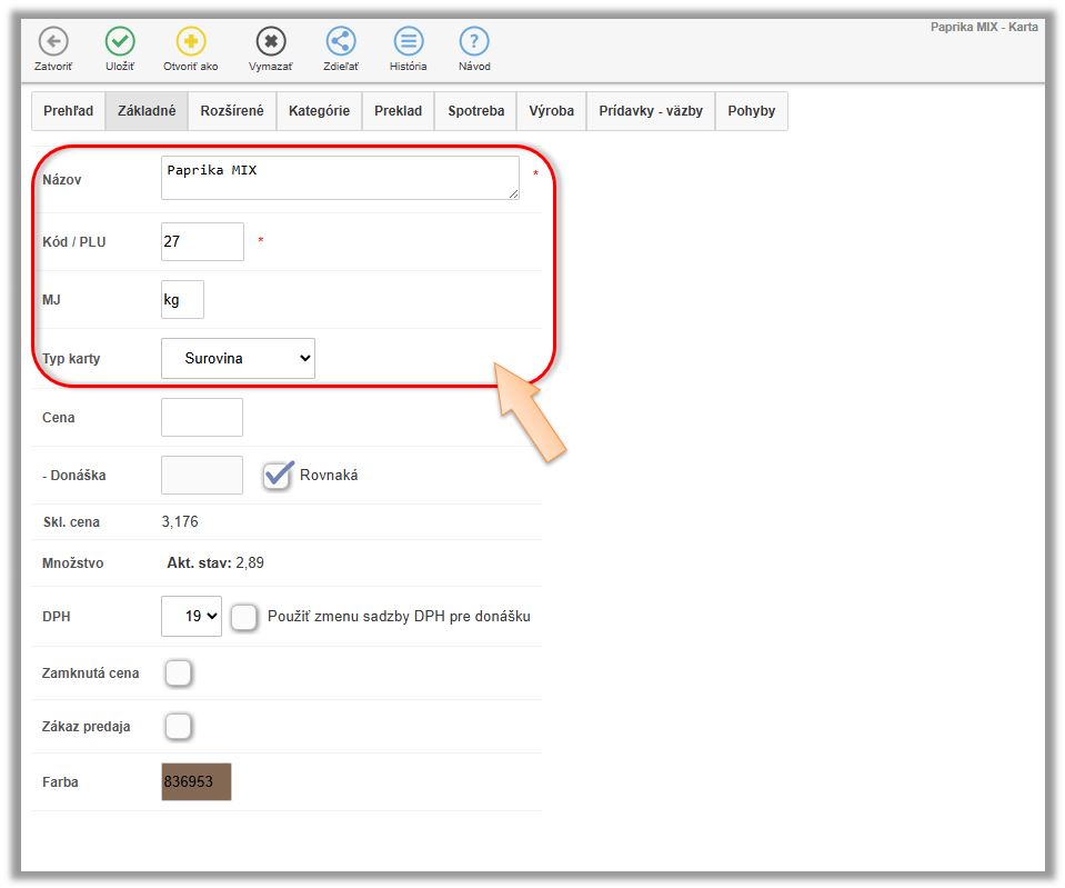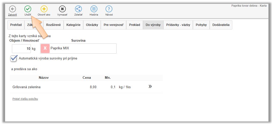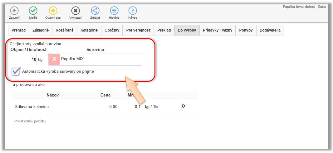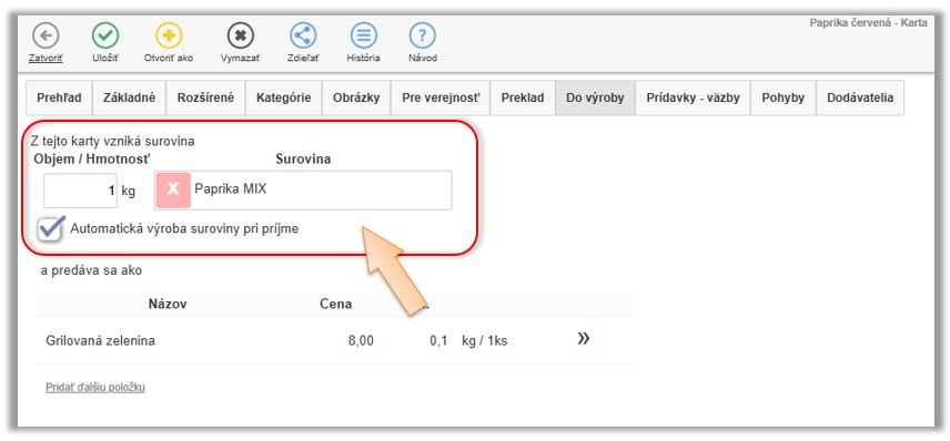 Tento scenár evidencie znovu opíšeme na príklade papriky. Dodávateľ na doklade účtuje papriku ako 1ks - Paprika biela debnička 10kg, ale aby systém vedel správne odpisovať surovinu definovanú v receptúrach, potrebujete to prijať rovno ako paprika biela 10kg. V tomto prípade sa tovar naskladňuje a eviduje na sklade v inej mernej jednotke a v inom počte ako je na doklade od dodávateľa.