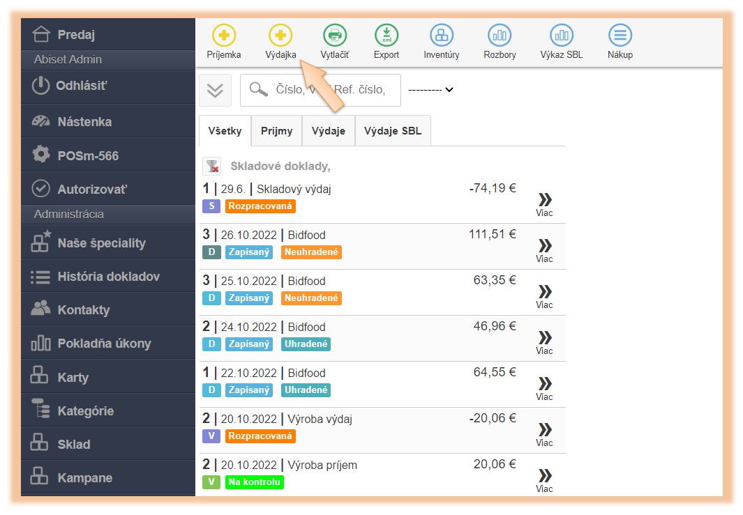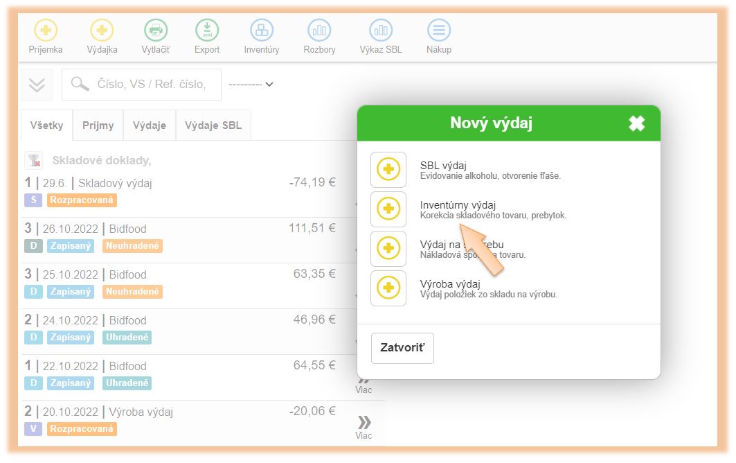 2. Kliknite na + Výdajka a vyberte možnosť Inventúrny výdaj.