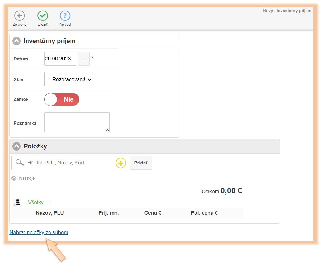 2. Vyberte možnosť + Príjemka a vyberte možnosť Inventúrny príjem.