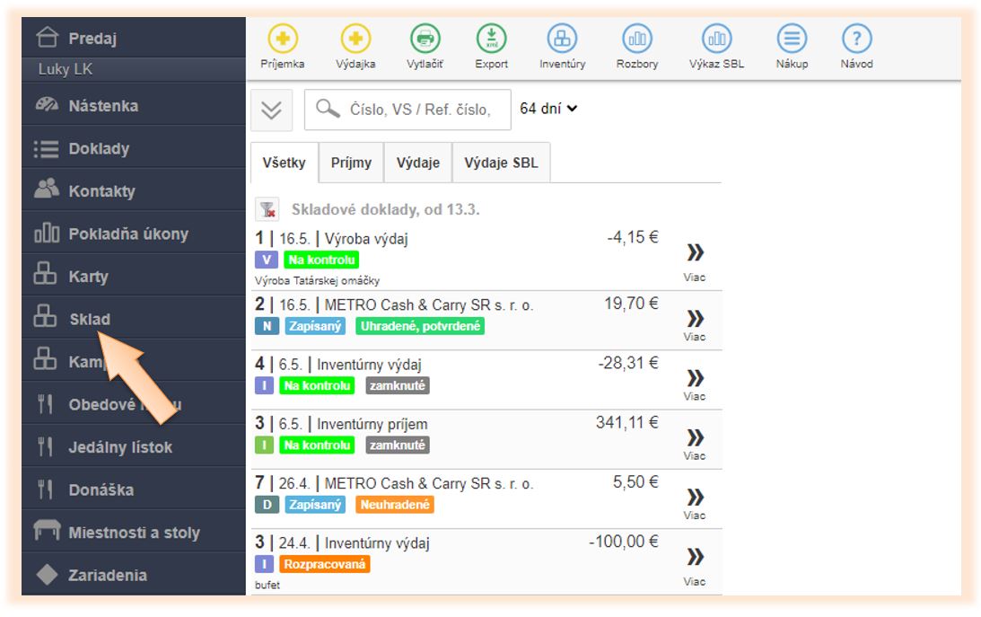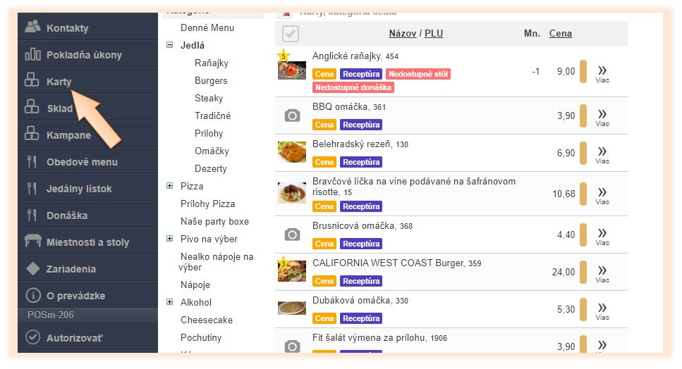 - Predaj priamo ako príloha k jedlu, napr. "Vyprážaný syr, hranolky, tatárska omáčka", kde sa nadefinuje priamo na danom jedle, koľko sa má zo suroviny odpísať.