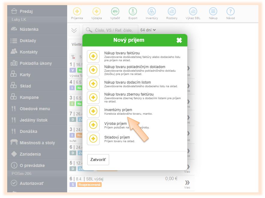 - V menu aplikácie Sklad kliknite na + Príjemka a vyberte Inventúrny príjem.