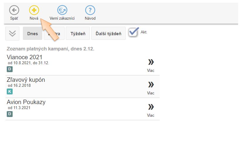 - Klknite na tlačidlo + Nová a vyberte možnosť Kampaň - Akcia 2 + 1.